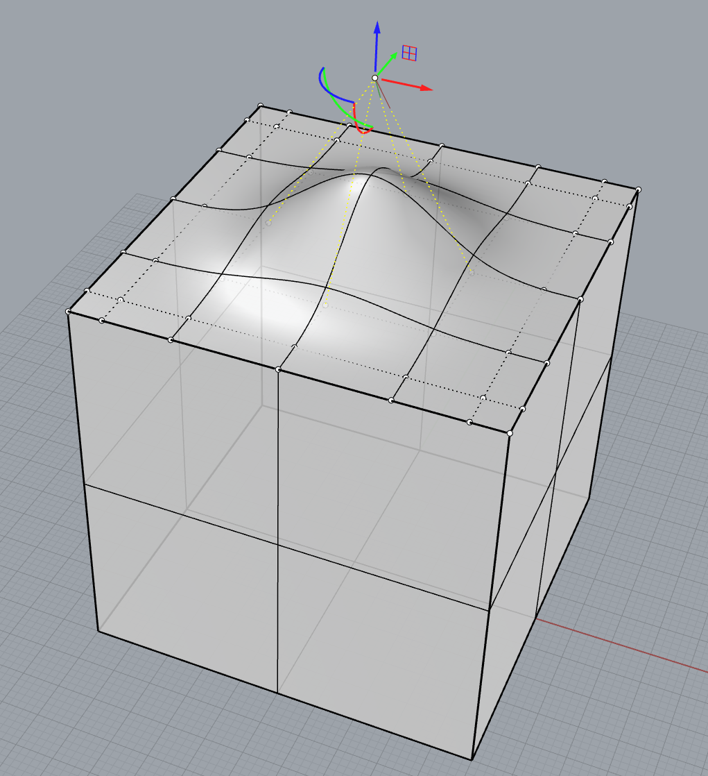 가운데 있는 제어점만 잡고 위치를 이동시켰다. 3차수이기 때문에, 가운데 제어점에 인접한 3번째 제어점까지 면의 모양이 변한다.